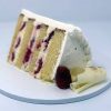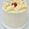 Inside: Yellow cake, white chocolate mousse, raspberries, whipped cream in every layer; Outside: Italian vanilla butter cream, white chocolate shavings.